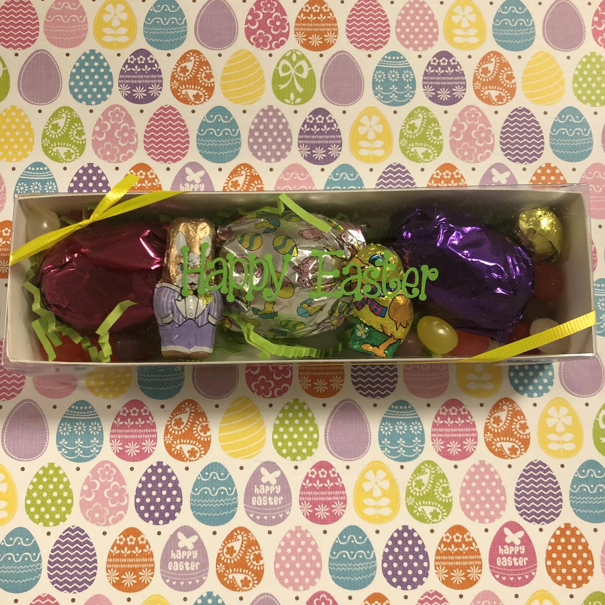 Easter box with 3 of Regina’s hand made filled eggs, 2 small foil wrapped chocolates and a handful of jelly beans.