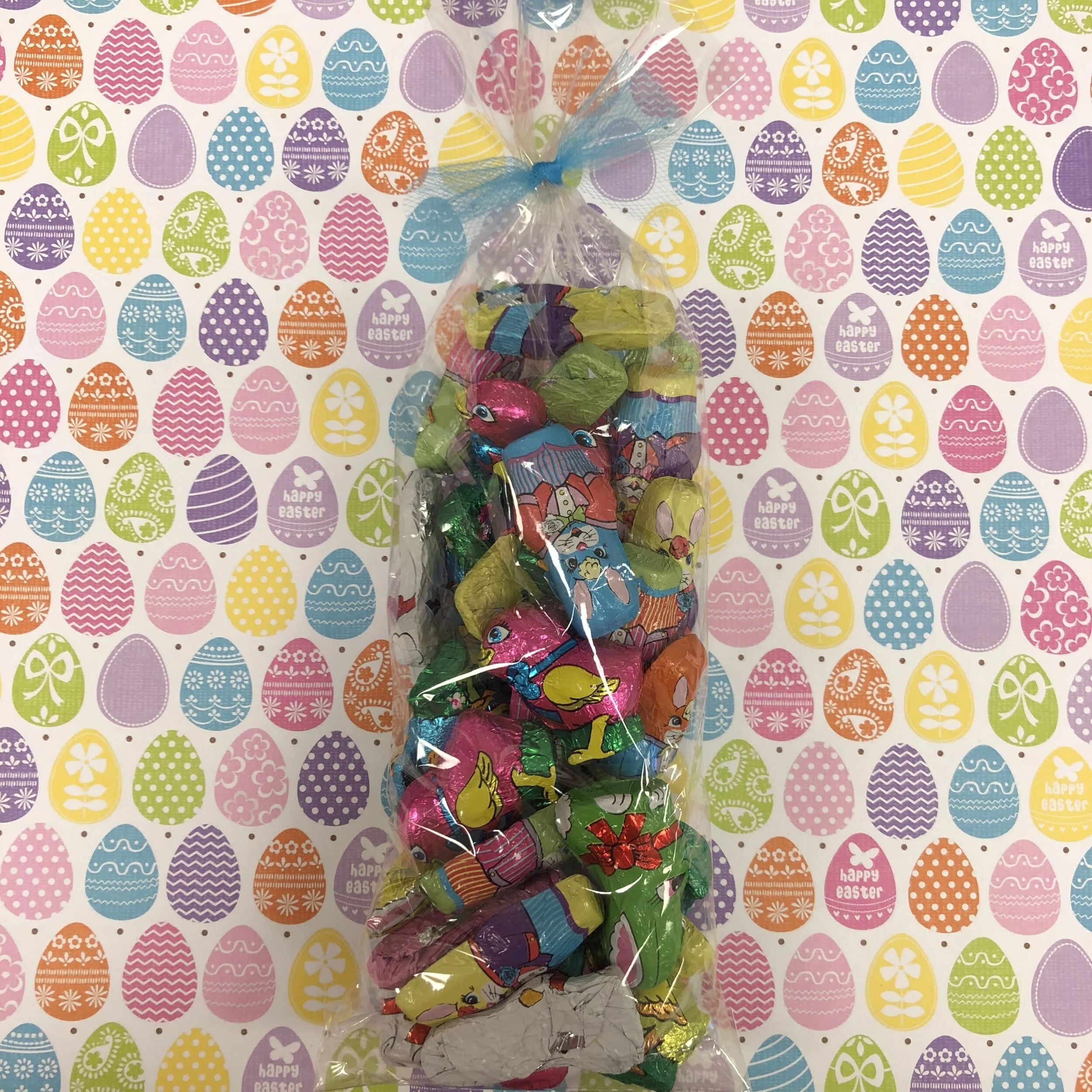 Shop › Milk Chocolate Foil Wrapped Bunnies and Chicks Image 1 of 1 Milk Chocolate Foil Wrapped Bunnies and Chicks $16.29 10 ounce bag of milk chocolate foil wrapped bunnies and chicks. Add To Cart Added! 10 ounce bag of milk chocolate foil wrapped bunnies and chicks.